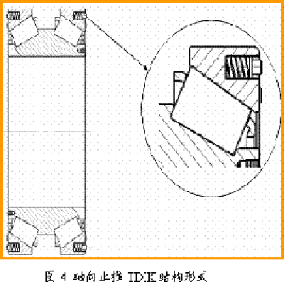 在轴向载荷较大的轧辊系统中,如轧辊轴向窜辊系统,为获得理想的轴承性能,通常需要额外止推轴承。由于轧辊轴向载荷具有双向性或方向很难判断特点,通常止推轴承选用双列结构形式。铁姆肯公司拥有自主设计的止推双列滚子轴承TDIK已被广泛地用于支撑辊 、工作辊轴向位置支撑。该类型轴承接触角大,K系数低,内圈有键槽防止跑圈,另外轴承外圈可以预装弹簧装置,如图4所示该轴承结构。轧辊轴向载荷及其作用方向会导致止推轴承单列承载,另外一列轴承滚子会处于不受力状态。在轴承的使用中,载荷过低、没有载荷或过大,轴承均会提早损坏。TDIK轴承外圈预装弹簧产生的预紧力可确保不受力端滚子与外圈滚道紧密贴合,避免不受力端滚子在运转过程中出现歪斜、打滑、撞击保持架等情况,Z终导致保持架断裂,轴承提前失效。