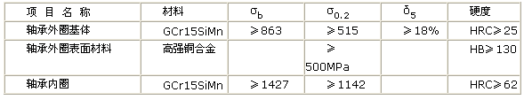 (1) 外圈采取轴向分开型式(双半外圈),材料为双金属自润滑材料:表面层为三环公司高强铜合金,钢基体材料为GCr15SiMn正火处理,摩擦表面镶嵌固体润滑剂。铜合金表层与钢基体之间采取堆焊工艺,两者之间为冶金结合。