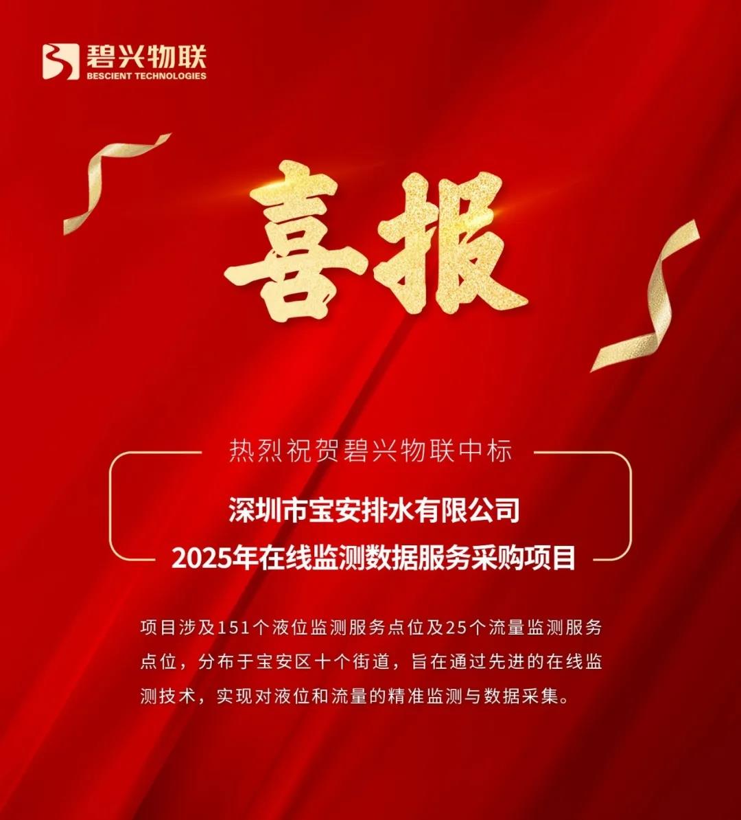 2025年4月7日,碧兴物联成功中标深圳市宝安排水有限公司2025年在线监测数据服务项目。此次项目中标再次体现了碧兴物联在水利水务领域技术及服务能力的优势,助力公司水利水务业务加速增长。