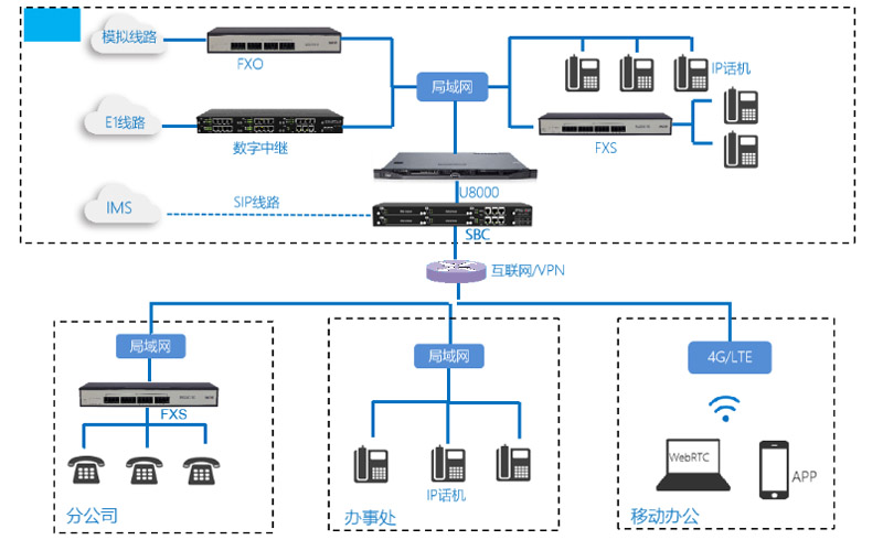 企业融合通信解决方案(总部+分公司多地组网)特点: