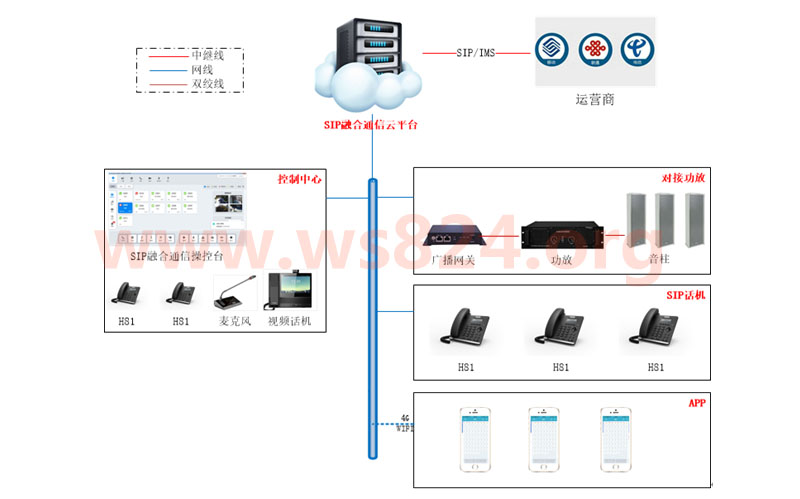 根据建设现状和建设需求,我们将采用SIP融合通信平台及SIP终端来设计整个方案;把服务器设计在云端或者中心机房,通过互联网连通所有SIP终端及其他系统;方案设计逻辑架构如下: