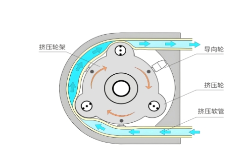 “挤压-回弹”的循环:电机带动转子旋转,辊轮依次碾压软管,形成局部封闭的液腔